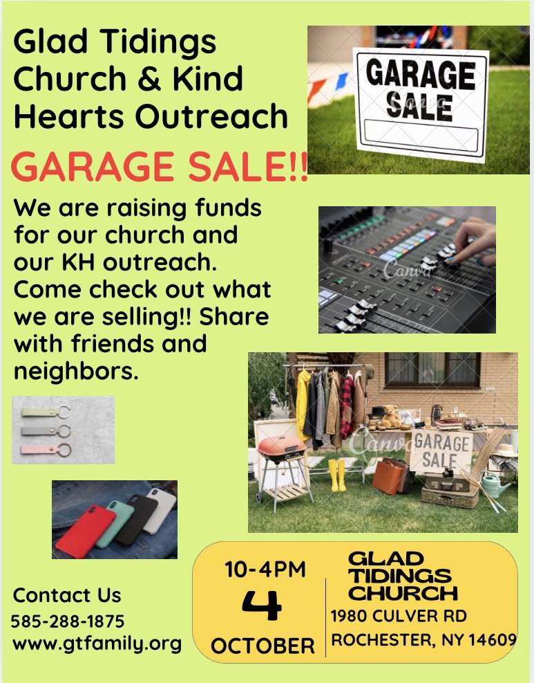 Come out for the Glad Tidings Garage Sale on October 4th.
